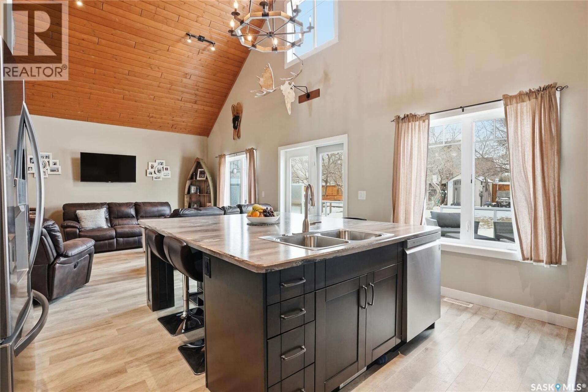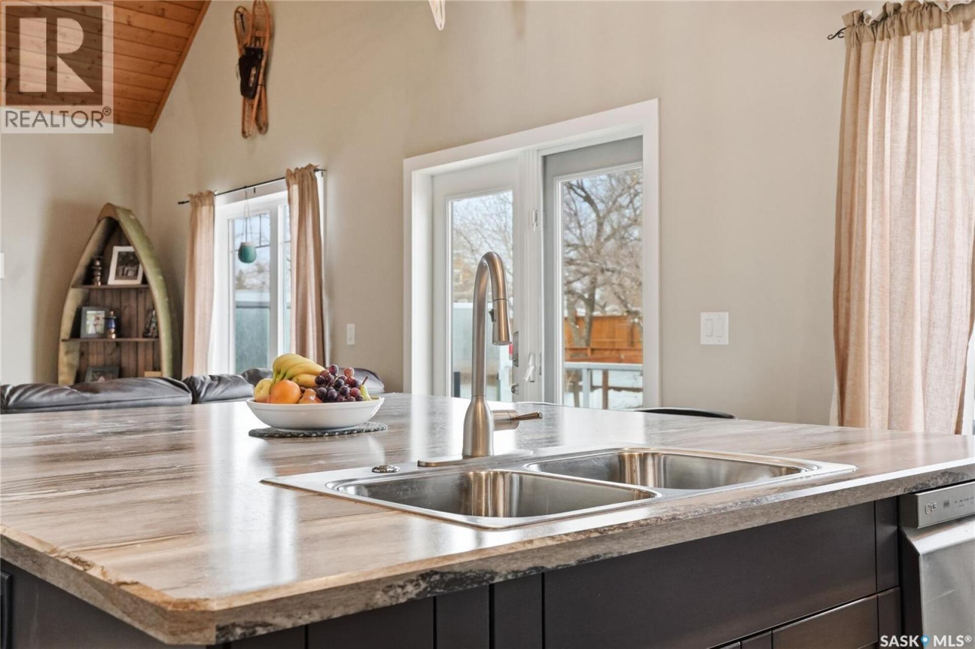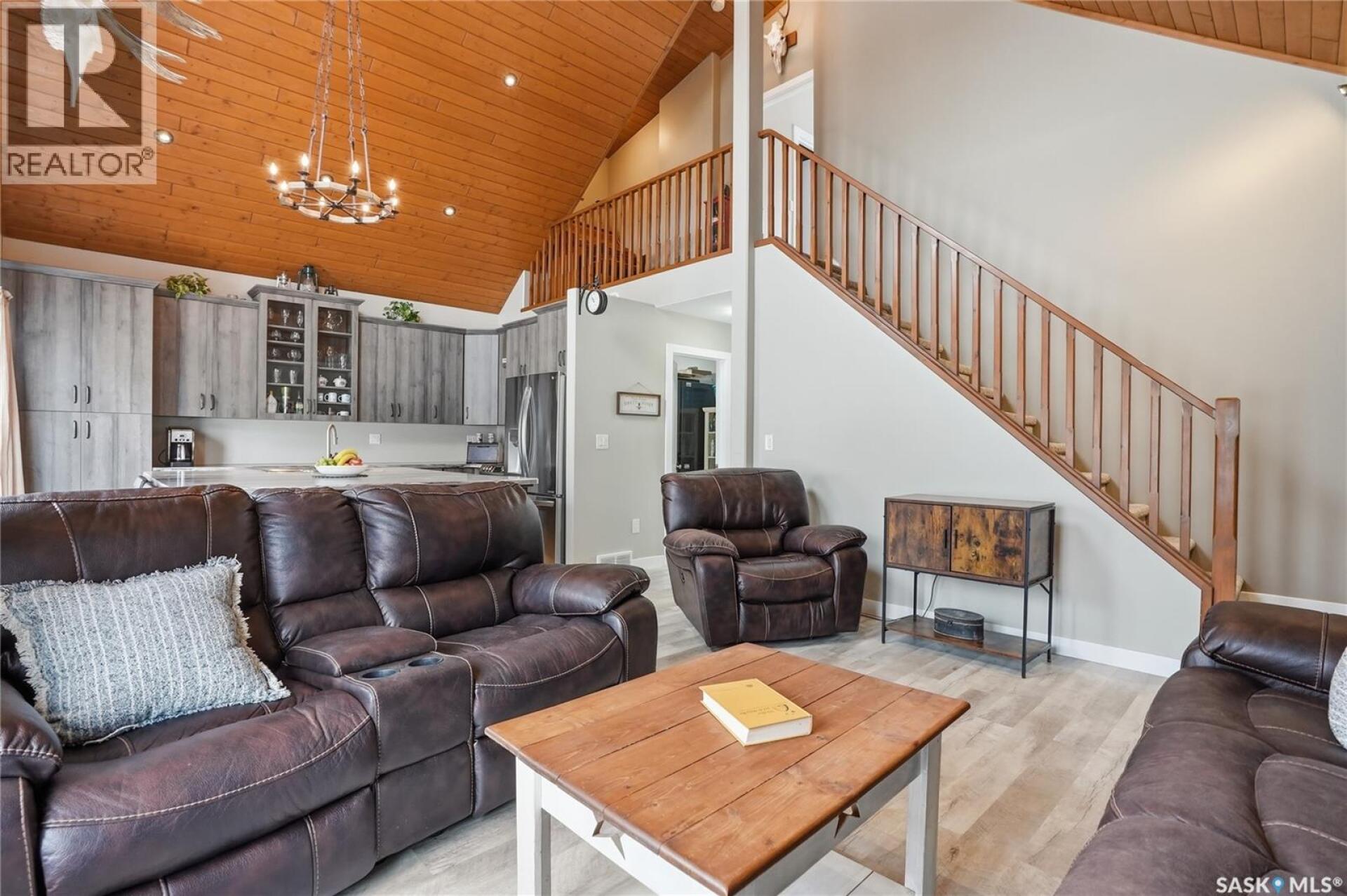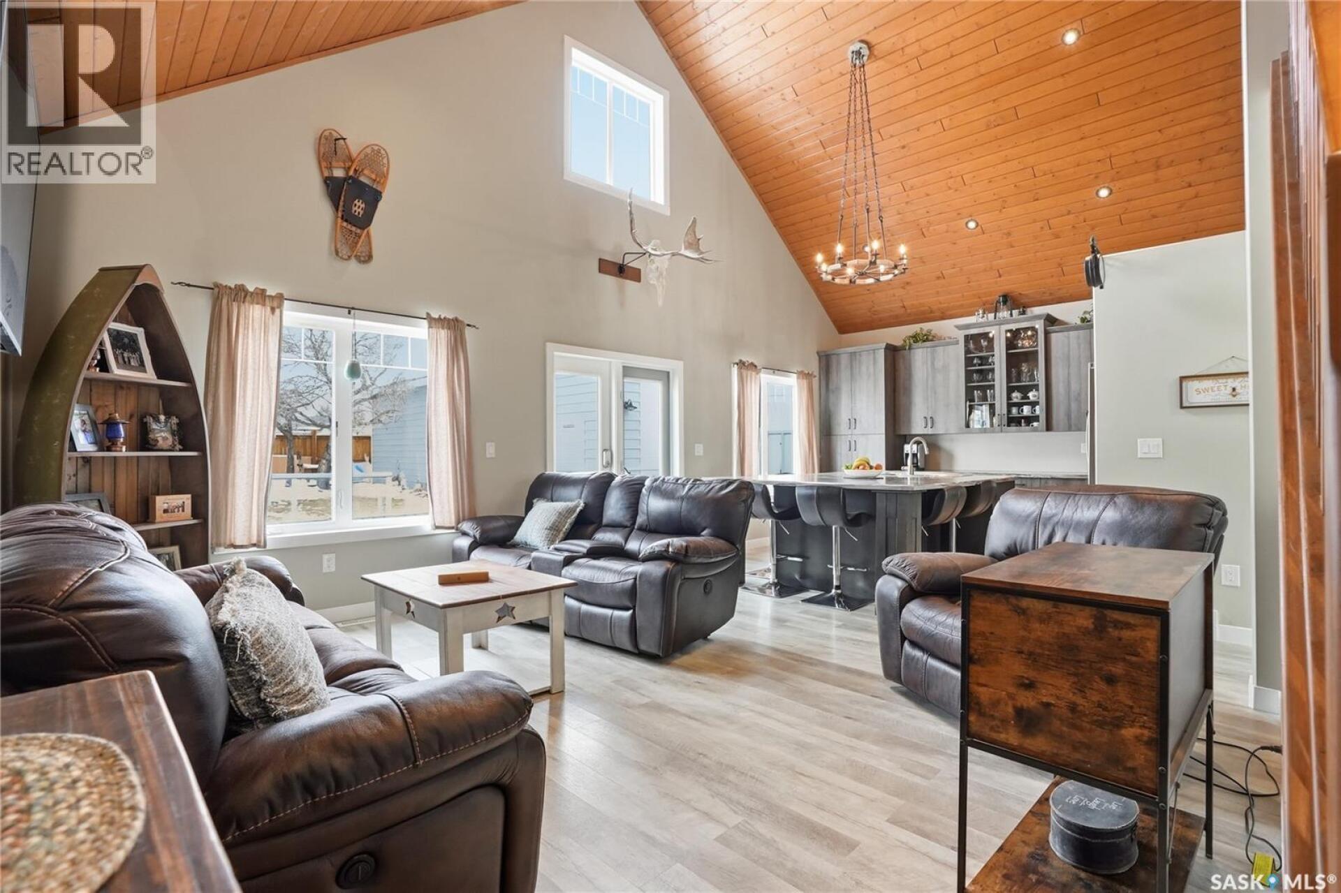 Welcome to this 4-season cabin at Sandy Shores Resort on Lake Diefenbaker, just 1 hour from Saskatoon via Highway 219. Situated on an extra-large titled corner lot 120ft x 131ft (double the width of a standard lot - can be subdivided), this property offers mature trees, exceptional space, and plenty of parking for boats, vehicles, and guests. A standout feature is the heated 2-car garage/shop with a 10’9” overhead door, ideal for storing a pontoon or recreational equipment. The fully fenced yard includes multiple access gates for added convenience. Inside, the bungalow-style home features 3 bedrooms and 2 bathrooms, including a lofted primary suite with walk-in closet and 4-piece ensuite bathroom. The spacious kitchen offers abundant cabinetry, stainless steel appliances (including dishwasher), and a large island, with an optional smaller countertop available. Vinyl plank flooring, in-home laundry, and a patio door leading to a large back deck complete the home. Central air conditioning ensures comfort during warmer months. Built with ICF foundation walls and equipped with a carbon filtration/de-chlorination system, this home combines durability, efficiency, and lifestyle. Enjoy resort-style living with access to a marina, nearby boat launch, sandy beaches, playground, sport court, and walking trails, along with treated water and year-round maintained roads. Lake Diefenbaker is known for its excellent fishing, boating, and sailing, making this an ideal destination for outdoor enthusiasts and year-round recreation. Call your favourite realtor today and book your private tour! (29586001)