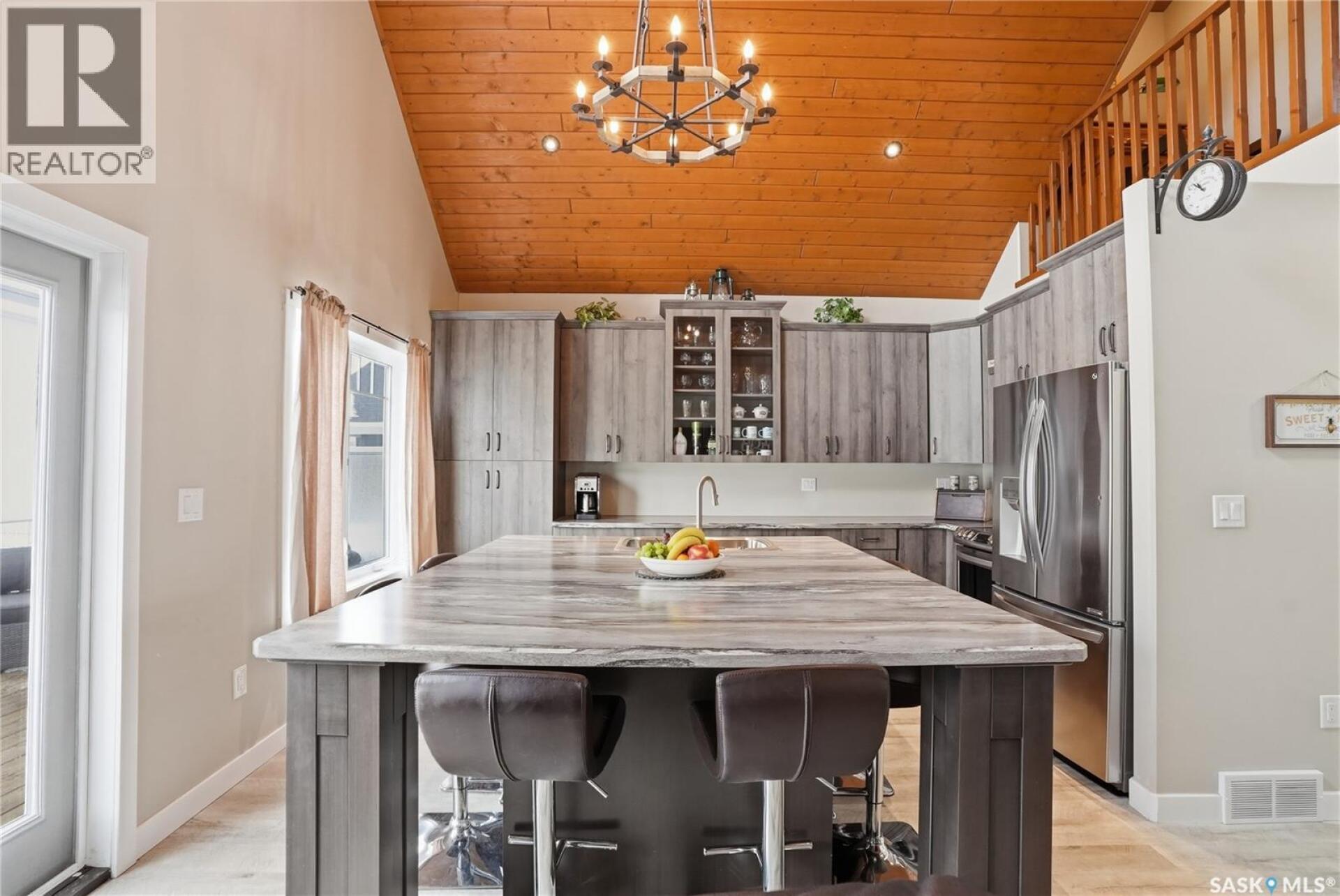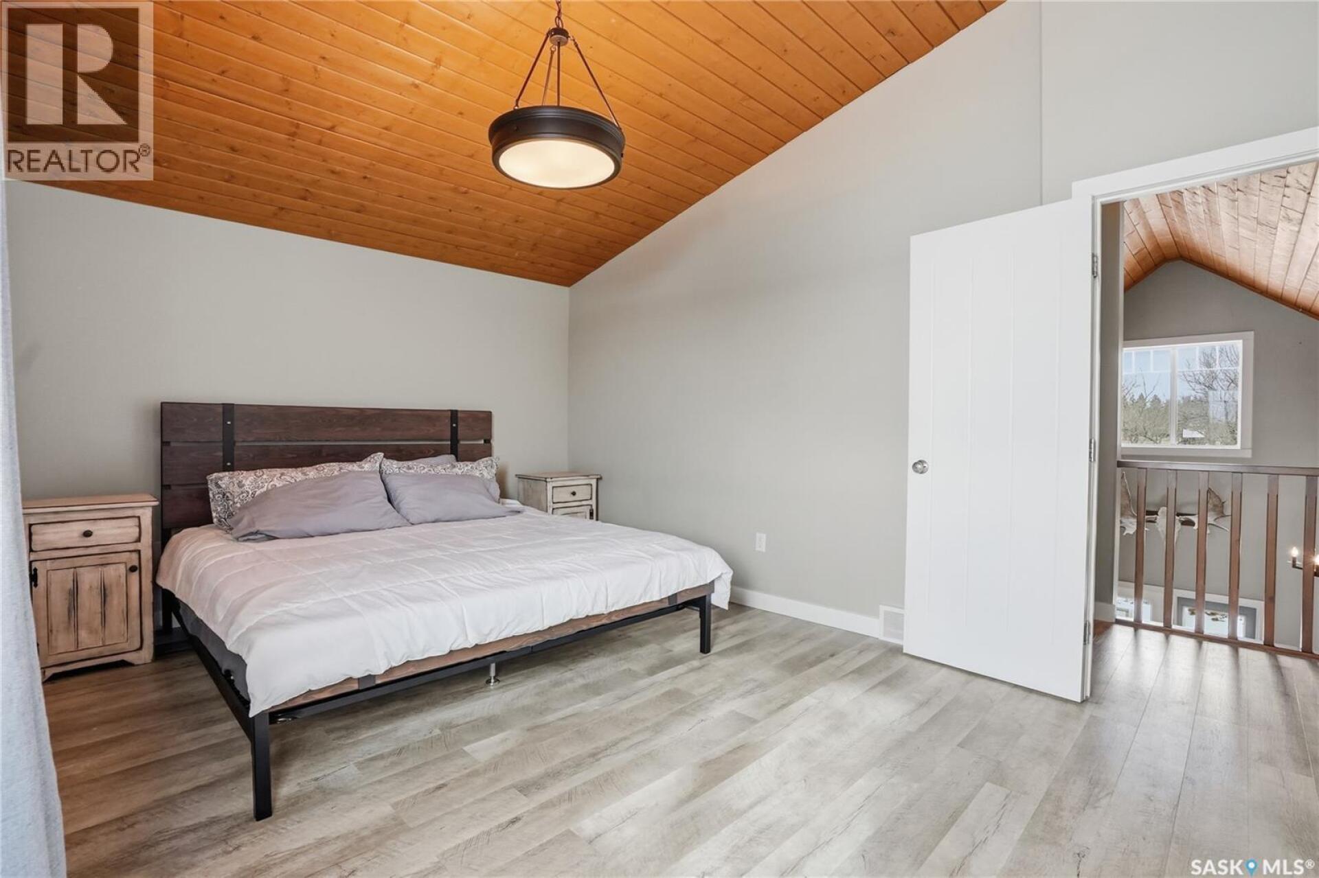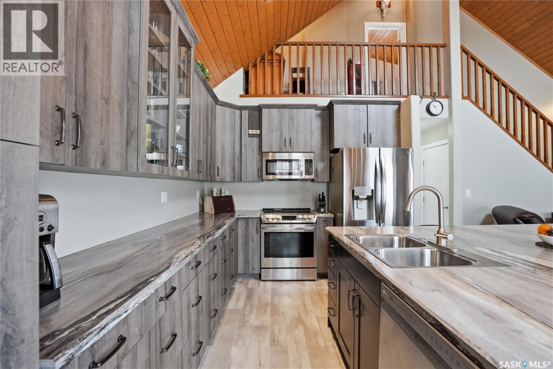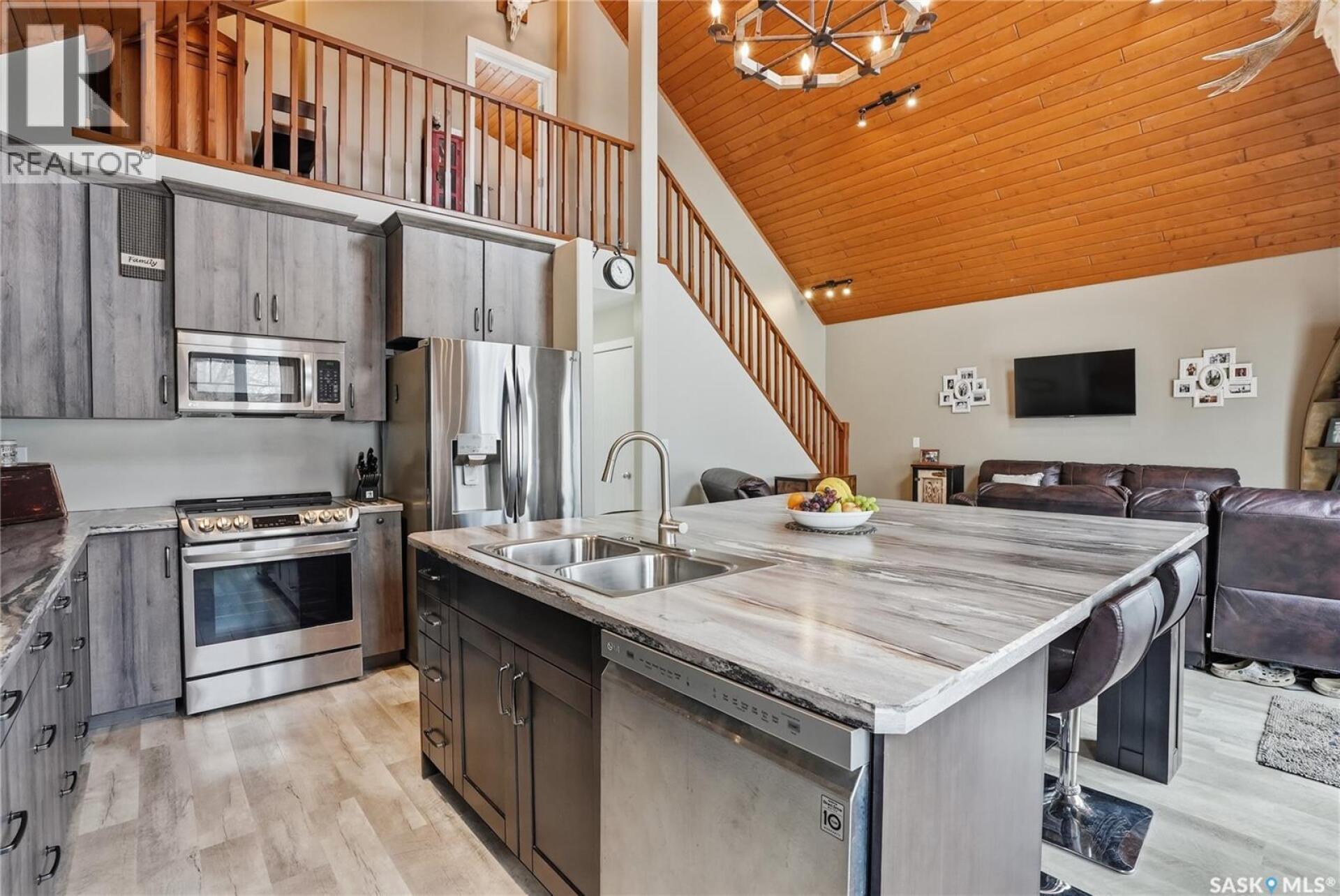 Welcome to this 4-season cabin at Sandy Shores Resort on Lake Diefenbaker, just 1 hour from Saskatoon via Highway 219. Situated on an extra-large titled corner lot 120ft x 131ft (double the width of a standard lot - can be subdivided), this property offers mature trees, exceptional space, and plenty of parking for boats, vehicles, and guests. A standout feature is the heated 2-car garage/shop with a 10’9” overhead door, ideal for storing a pontoon or recreational equipment. The fully fenced yard includes multiple access gates for added convenience. Inside, the bungalow-style home features 3 bedrooms and 2 bathrooms, including a lofted primary suite with walk-in closet and 4-piece ensuite bathroom. The spacious kitchen offers abundant cabinetry, stainless steel appliances (including dishwasher), and a large island, with an optional smaller countertop available. Vinyl plank flooring, in-home laundry, and a patio door leading to a large back deck complete the home. Central air conditioning ensures comfort during warmer months. Built with ICF foundation walls and equipped with a carbon filtration/de-chlorination system, this home combines durability, efficiency, and lifestyle. Enjoy resort-style living with access to a marina, nearby boat launch, sandy beaches, playground, sport court, and walking trails, along with treated water and year-round maintained roads. Lake Diefenbaker is known for its excellent fishing, boating, and sailing, making this an ideal destination for outdoor enthusiasts and year-round recreation. Call your favourite realtor today and book your private tour! (29586001)
