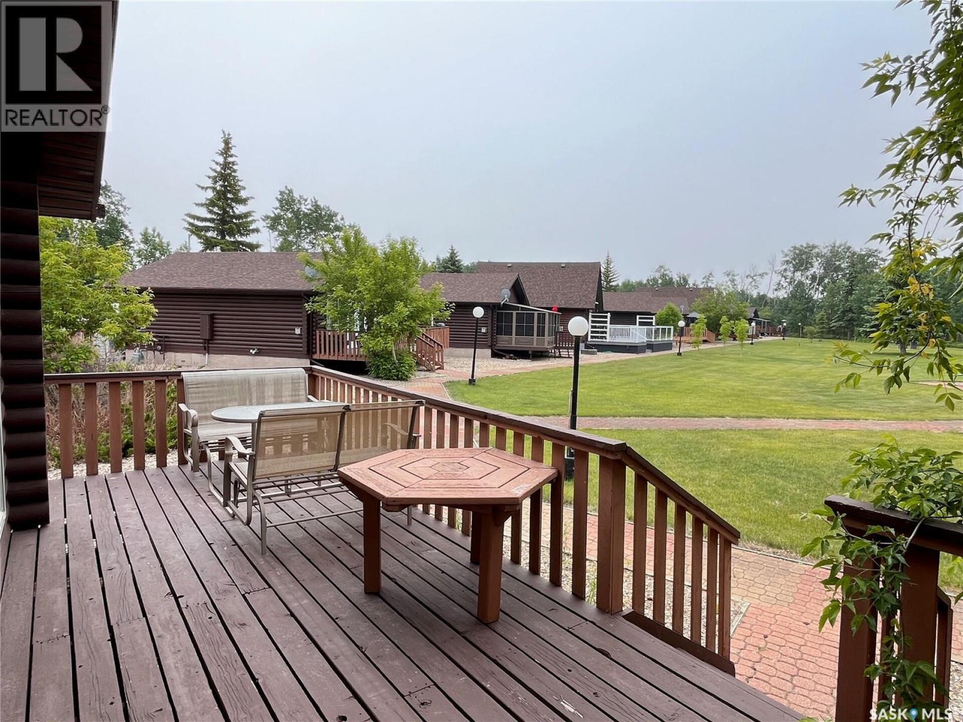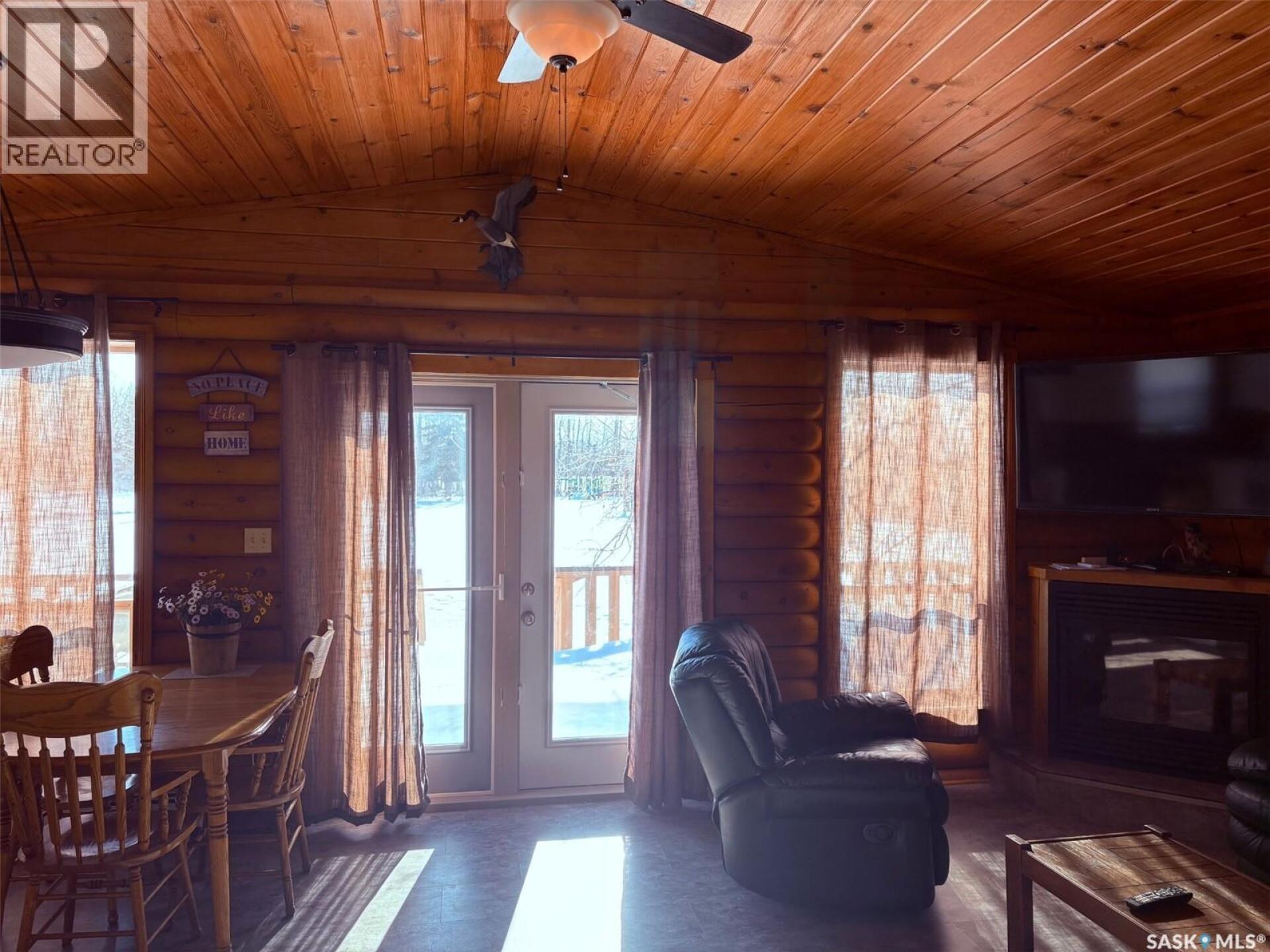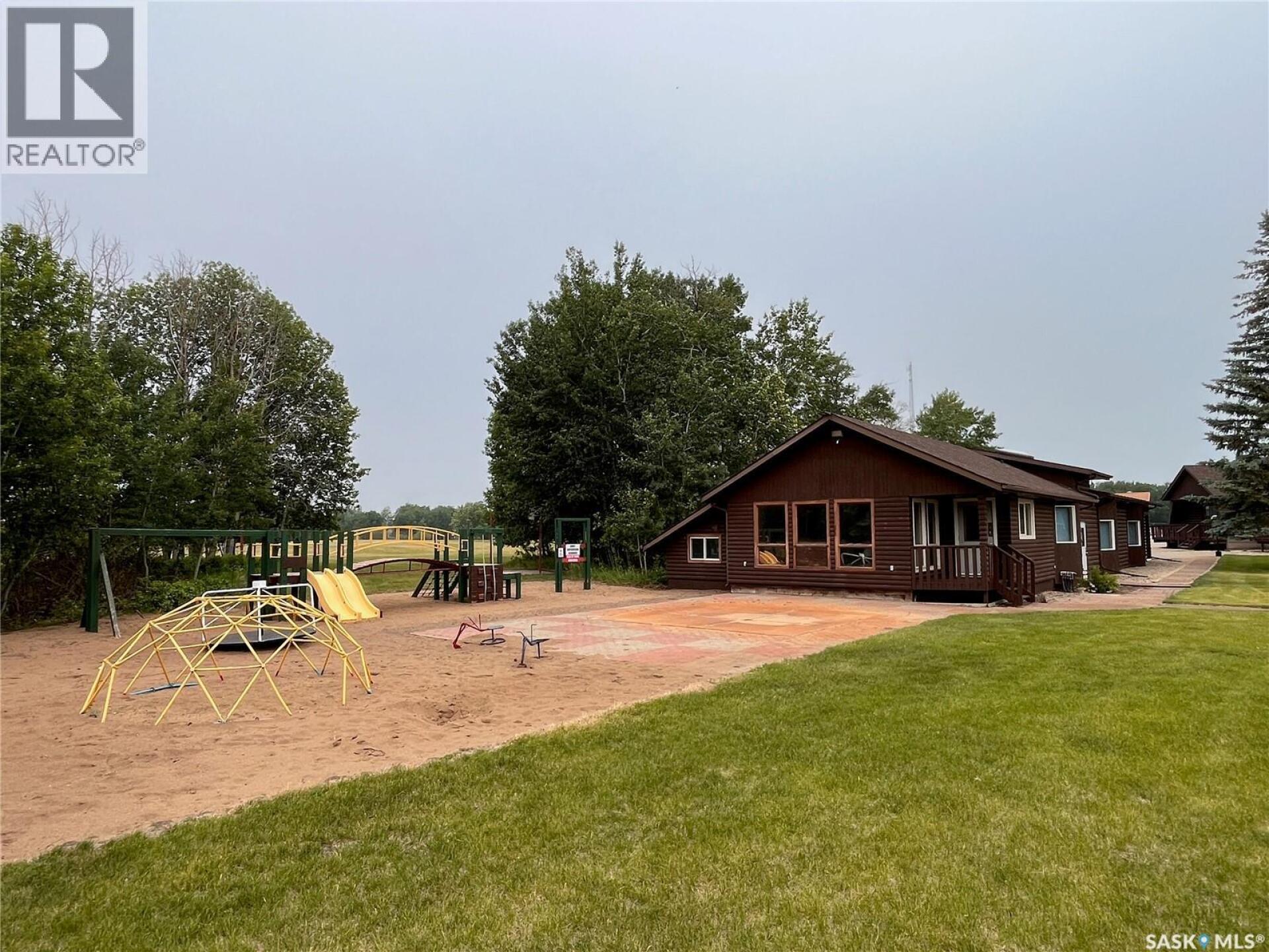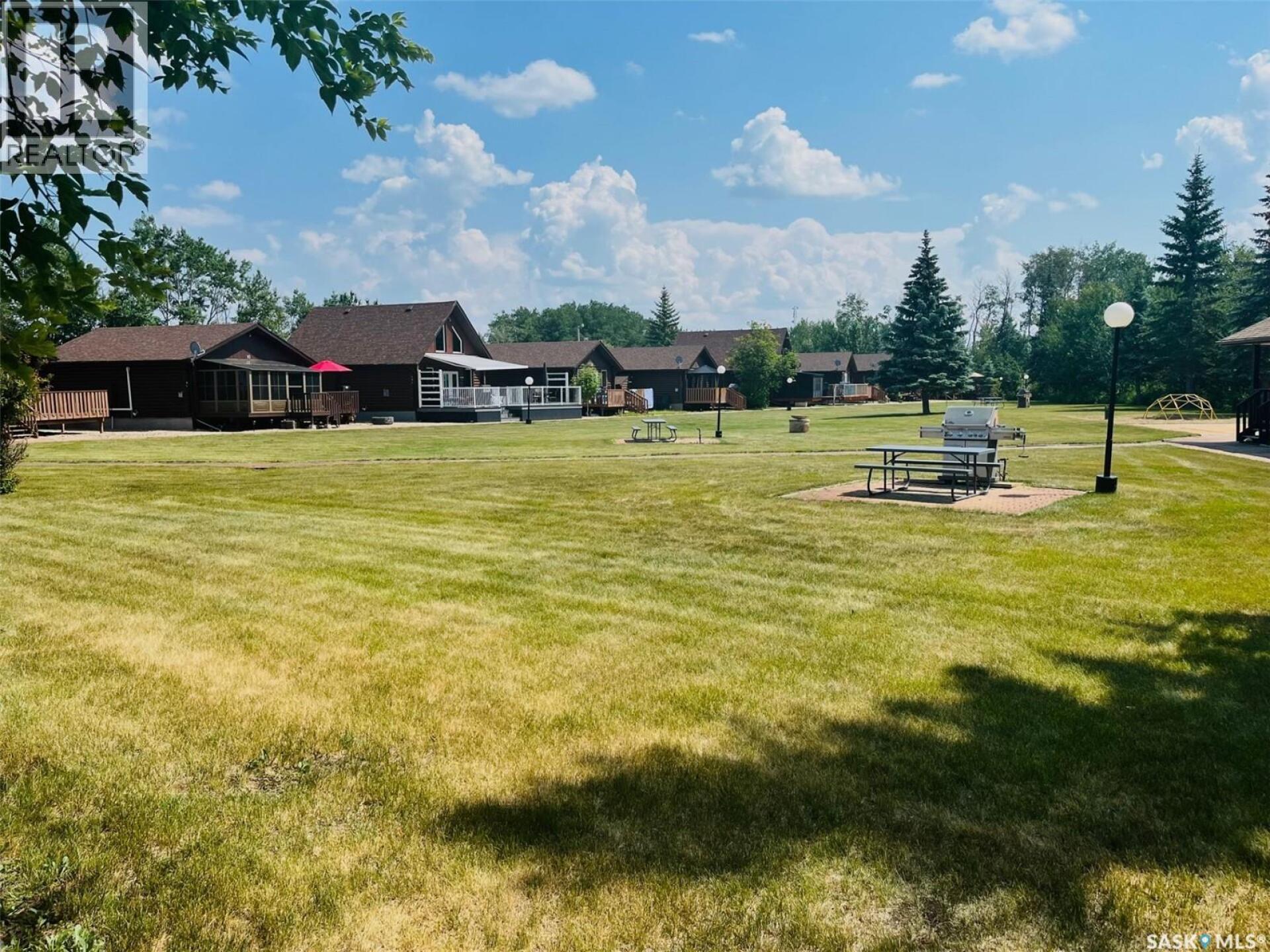 Welcome to your own retreat at Good Spirit Acres, where comfort meets convenience in a serene, low-maintenance setting just minutes from Good Spirit Lake Provincial Park. This charming year-round log cabin offers 672 square feet of thoughtfully designed single-level living, ideal for anyone looking to enjoy lake life without the hassle of yard work or exterior maintenance. Simply arrive, unwind, and embrace everything this beautiful area has to offer. The bright, functional kitchen comes fully equipped with a fridge, stove, and above-the-range microwave, flowing seamlessly into the dining area with direct access to the deck — perfect for morning coffee or relaxing evenings. The inviting living room features a cozy gas fireplace and mounted television, creating a warm and welcoming atmosphere, all within an open-concept kitchen, dining, and living space. Two well-sized bedrooms and a full four-piece bathroom complete the layout, providing comfortable accommodations for family or guests. A couch set, bed, and TV are included, making this home truly move-in ready. Outside, you’ll appreciate the interlocking brick sidewalk and parking pad with room to build a garage, along with a deck that overlooks a peaceful green space featuring lawn and a small playground area — ideal for enjoying the outdoors in a quiet, community-focused setting. Residents enjoy easy access to beach life, boating, golf, walking trails, a nearby convenience store, and year-round recreational activities, all while being conveniently located approximately 35 minutes from Yorkton. Condo fees of $450 per month (subject to change) provide exceptional value by covering power, gas, water, exterior maintenance, exterior insurance, and contributions to the reserve fund, allowing for truly stress-free ownership. Experience easy lake living and the beauty of nature — your peaceful escape awaits at Good Spirit Acres. (29439399)